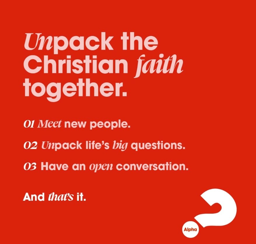 Alpha is a series of sessions that freely explore the big questions of life. It’s an opportunity to get connected, discover more about the Christian faith, and share your thoughts in a friendly, open environment.